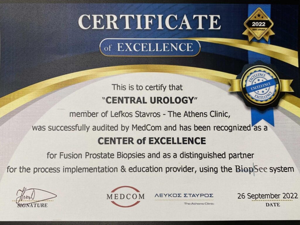 -Το 2022 ο Δρ. Ι. Λεωτσάκος και ο Δρ. Ι. Καταφυγιώτης ως βασικοί συνιδρυτές της ομάδας Central Urology και οι υπεύθυνοι του τμήματος διαπερινεϊκής Fusion βιοψίας προστάτη, κατόπιν αυστηρής αξιολόγησης ικανοποίησαν όλα τα απαιτητικά κριτήρια της Γερμανικής Εταιρείας Medcom (κλινικά και ακαδημαϊκά) και έλαβαν την πιστοποίηση του κέντρου αριστείας για την διαπερινεϊκή Fusion βιοψία προστάτη σε όλη την Νοτιοανατολική Ευρώπη.