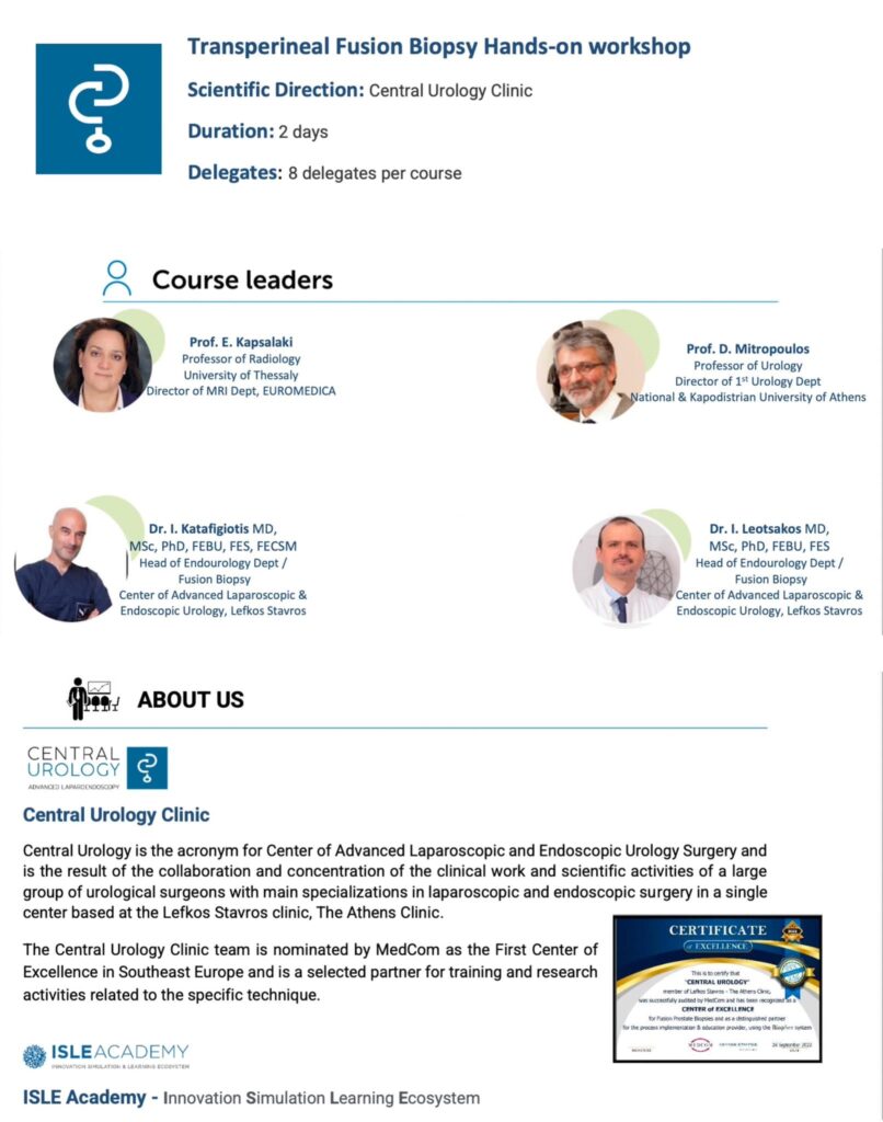 -Το διάστημα 2022-2024 ο Δρ. Ι. Λεωτσάκος και ο Δρ. Ι. Καταφυγιώτης συνδιοργάνωσαν και πραγματοποίησαν με την ακαδημία ISLE, το κορυφαίο κέντρο εκπαιδευτικών σεμιναρίων εξομοίωσης, δύο διεθνή σεμινάρια για την τεχνική της διαπερινεϊκής Fusion βιοψίας προστάτη με τη συμμετοχή της καθηγήτριας ακτινολογίας κ. Ε. Καψαλάκη και του καθηγητή της 1ης Πανεπιστημιακής Ουρολογικής κλινικής κ. Δ. Μητρόπουλου, όπου ουρολόγοι από την Ελλάδα και το εξωτερικό εκπαιδεύτηκαν στην τεχνική.